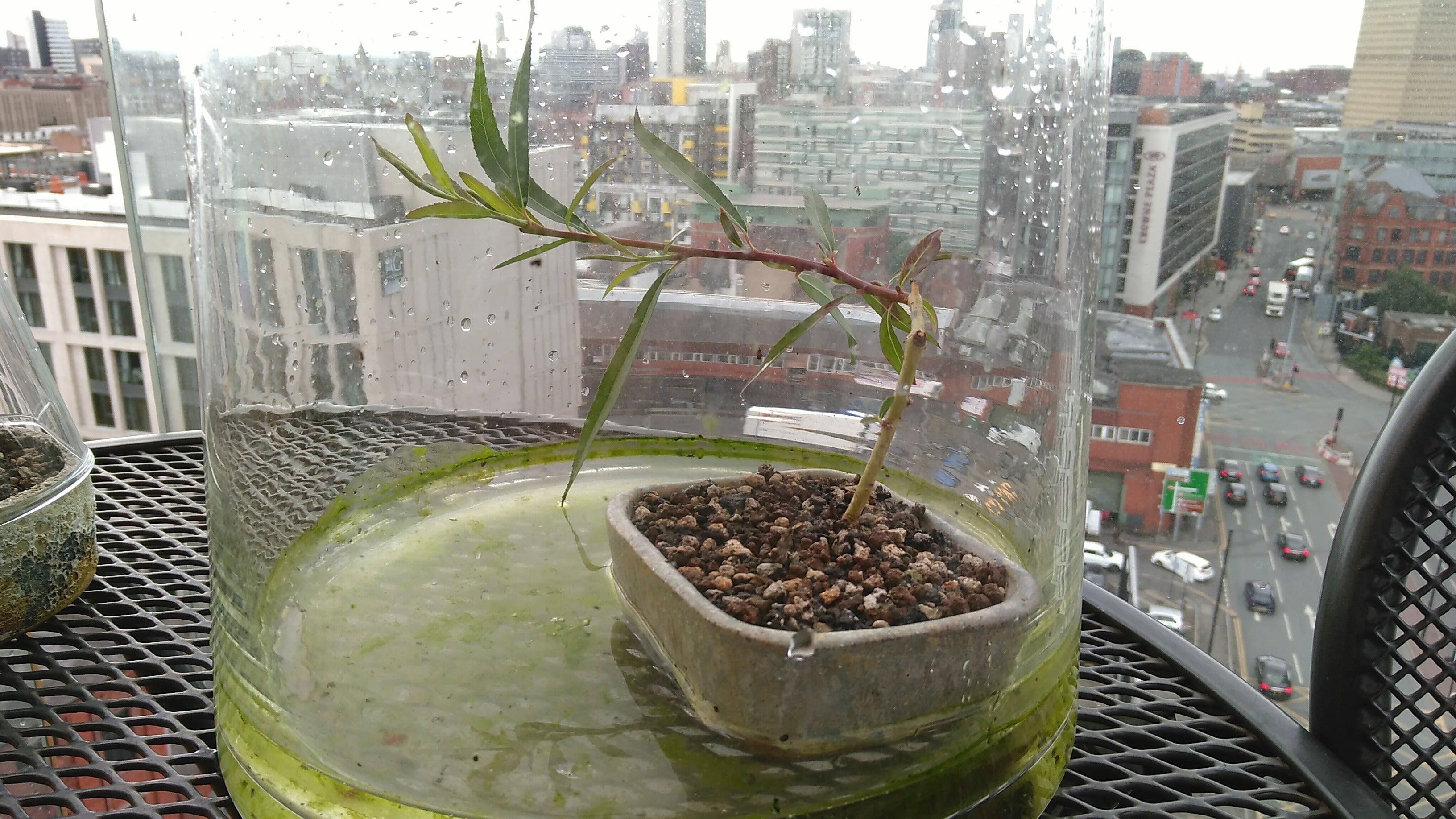 For a long while I was leaving it standing free and watering it daily: willows are very thirsty and need the soil to stay permentantly damp. But a few weeks ago I was away from the house for 3 days and needed some way to keep it watered. I used an idea I saw on the Bonsai Zone tried leaving it standing in a level of slightly fertilized water, and it's been a resounding success! The only down side is that the fertilized water is a hotbed for algea, so I have to fully clean and change the water once a week.